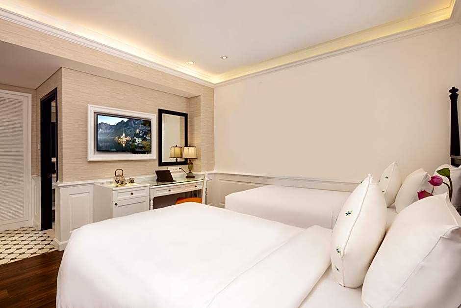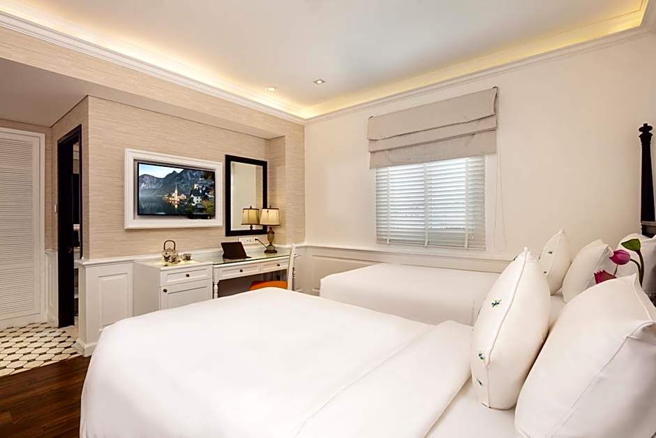 A beautifully designed suite featuring a comfortable seating area, elegant tile/marble flooring, air conditioning, and complimentary bathrobes. The suite offers a spacious and relaxing atmosphere inspired by Indochine esthetics.
